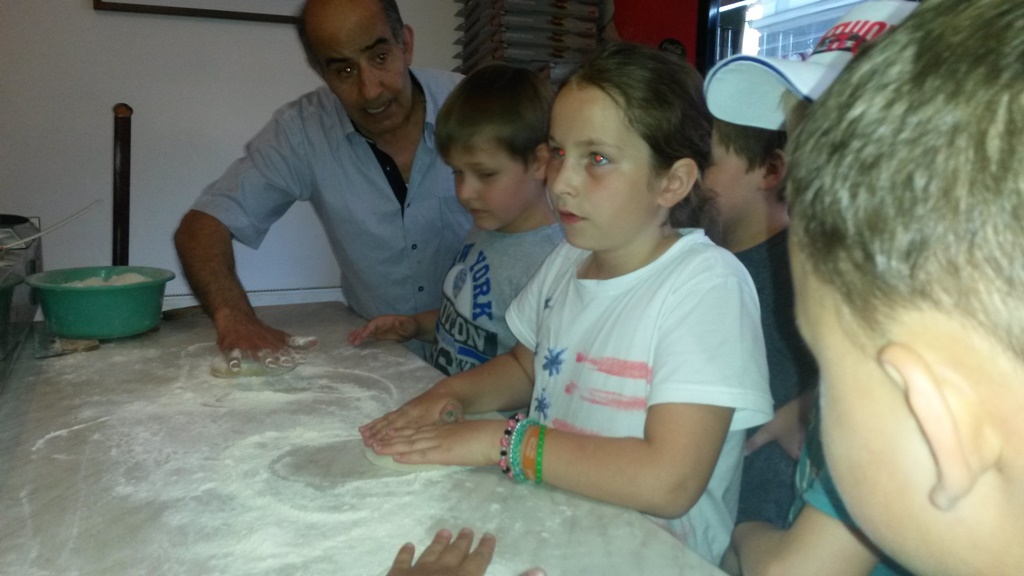 Das Abendessen wurde in der Pizzeria Giovanni zubereitet. Die Kinder durften selbst Teig kneten und ihre Pizzas belegen, die wir uns dann im Schulhof schmecken ließen.
