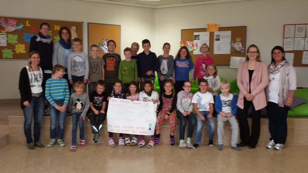 Alle 3. Klassen konnten an den Workshops für Gewaltprävention von Power4me teilnehmen, die größtenteils von der Raika Gföhl finanziert wurden. Kursleiterin Nadja Pichler bemühte sich, den Kindern unter anderem auch beizubringen, wie wichtig es ist, in bedrängenden Situationen laut schreien zu können. Am Foto: Kinder und Lehrerinnen der 3a mit Kursleiterin Nadja Pichler , Raika-Direktorin Evelyn Strasser-Braunsteiner