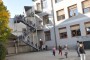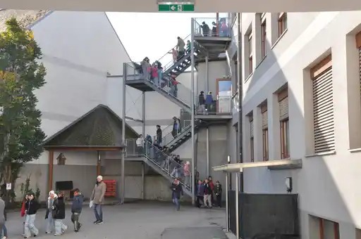 gemeinsame Evakuierungsübung: ein vorbereiteter Probealarm ertönte und die Klassen verließen geordnet auf den Fluchtwegen das Schulgebäude. Zwei Kinder, die im Vorfeld darüber informiert
