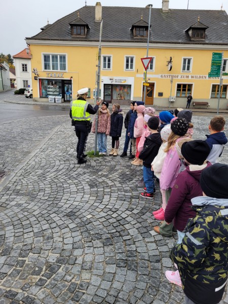 Sie wurden von einer Polizistin besucht. Diese hat mit den Kindern vorher in der Klasse einen kleinen Theorieteil vermittelt und anschließend wurde das richtige Überqueren des Zebrastreifens